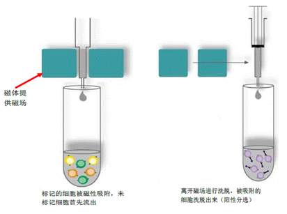 3、在高強(qiáng)度、梯度磁場(chǎng)中標(biāo)記的細(xì)胞被磁性吸附,未標(biāo)記細(xì)胞首先流出,然后洗脫被吸附的細(xì)胞(陽(yáng)性分選)達(dá)到細(xì)胞磁性分離的目的。