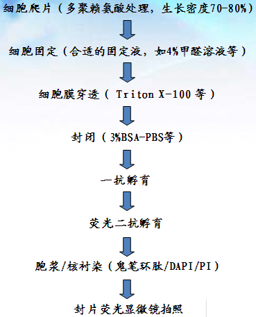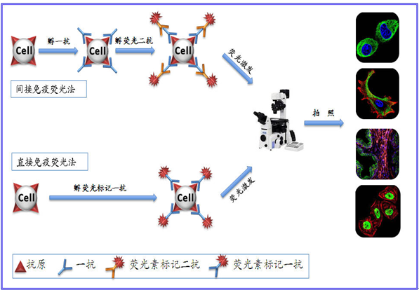 ?? 原理:免疫熒光就是利用抗原與抗體的特異性結(jié)合原理及特殊的熒光素標(biāo)記技術(shù),通過(guò)激光激發(fā)使熒光素發(fā)出熒光,在熒光顯微鏡下觀察熒光的變化從而對(duì)細(xì)胞內(nèi)的抗原進(jìn)行分析的技術(shù)。用免疫熒光顯示和檢查細(xì)胞或組織內(nèi)抗原或半抗原物質(zhì)等方法稱(chēng)為免疫熒光細(xì)胞(或組織)技術(shù)。