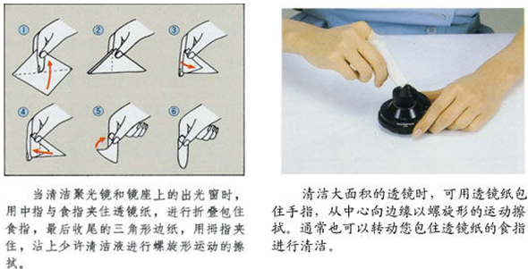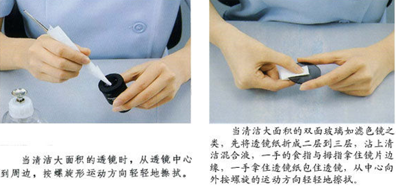 ??? 最好先用吹氣球或者吹氣槍先吹掉表面大的塵土顆粒,結(jié)合軟毛刷輕輕吹刷,因為這些顆粒往往容易劃傷鍍膜層,然后再用擦鏡紙醮取清潔液進(jìn)行擦拭??蓞⒖既缦聢D例所示方法: