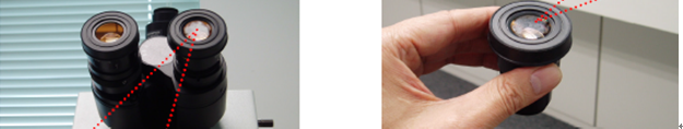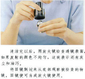 ??? 如上左圖,當(dāng)物鏡有臟物時,由于物鏡頂端的透鏡很小,往往肉眼很難分辨,可以拆卸一個目鏡,調(diào)轉(zhuǎn)一個方向則可當(dāng)成一個放大鏡使用(如上右圖),通過放大以后,物鏡表面的臟物將清晰可辨,可以清除。