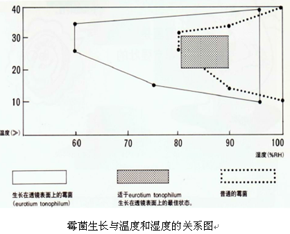 ??? 顯微鏡的光學(xué)表面都有防霉系統(tǒng),各個廠家都是采用化學(xué)藥品鍍膜防霉,一般有效期大約在7-8 年左右,超過8 年以后,防霉系統(tǒng)會失效,此時,應(yīng)該找顯微鏡廠家重新安置防霉片,否則,實驗室條件差的顯微鏡會開始長霉,南方潮濕地區(qū)特別顯著,霉菌會分泌有害物質(zhì)腐蝕玻璃表層的鍍膜層,霉菌密度大時危害特別大,這樣會嚴(yán)重危害顯微鏡的光學(xué)性能,因為鍍膜層是光學(xué)顯微鏡性能的關(guān)鍵所在。上圖是霉菌生長與溫度和濕度的關(guān)系圖(僅供參考)。