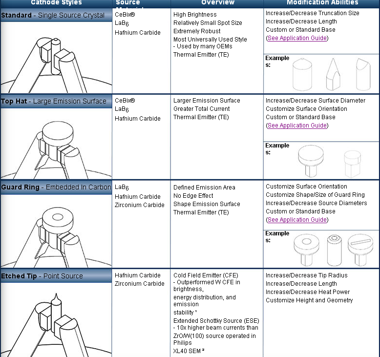 APTECH公司帶給大家四種常見材料的的電子發(fā)射源。熱游離發(fā)射thermal emission (TE)源有六硼化鑭(LaB6)和六硼化鈰(CeBix®)燈絲兩種;場(chǎng)發(fā)射電子槍有兩種:冷場(chǎng)發(fā)射式(cold field emission , FE),熱場(chǎng)發(fā)射式(thermal field emission ,TF),過渡金屬元素常作為場(chǎng)發(fā)射材料,而難熔金屬往往作為冷場(chǎng)發(fā)射源。