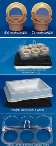 為確保實(shí)驗(yàn)的快速和高效,我們?yōu)楹Y籃配套了提手及籃架(carrier kit)和試劑盤(reagent tray)。篩籃可以直接放進(jìn)籃架,提到試劑盤進(jìn)行固定或者染色實(shí)驗(yàn)。試劑盤兩種顏色可供選擇:白色和黑色,白色試劑盤便于觀察顏色變化。黑色試劑盤便于清楚觀察切片位置。方便大家使用,我們提供以下套裝,套裝包含6個(gè)直徑24mm的netwell(或者12個(gè)直徑15mm的netwell);兩個(gè)試劑盤(一黑一白);提籃一套(carrier plate 和handle)。